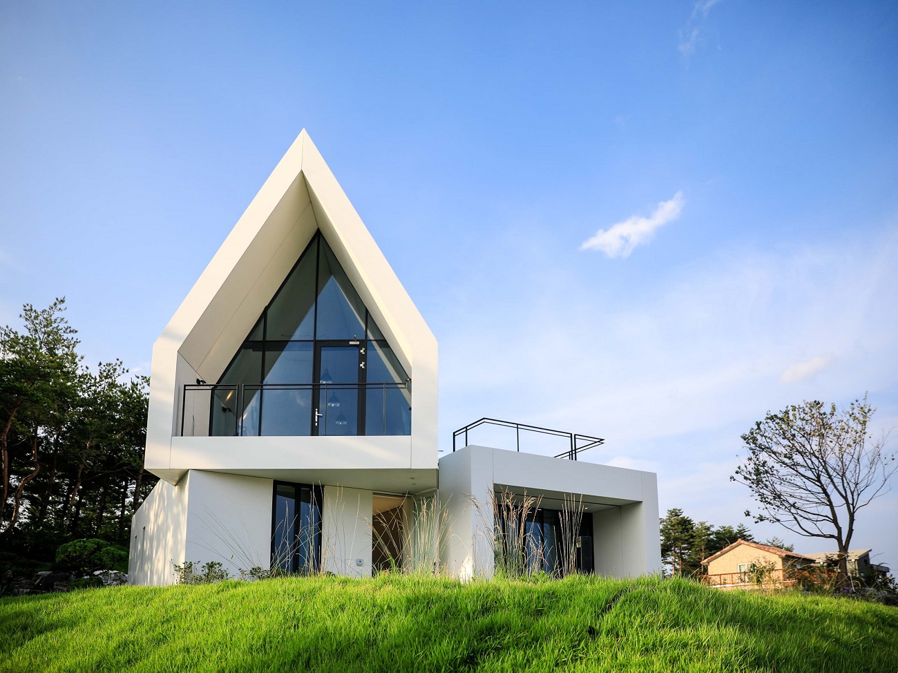 Fascinado por el «festival de luces» que ofrece la naturaleza, el arquitecto francocoreano Woojin Lim (de AEV Architectures), quien ha ejercido su profesión en París durante más de 20 años, soñaba con construir una casa en su país natal, en simbiosis con el entorno y que pudiera interactuar con la naturaleza. El resultado final es un majestuoso tejado de un blanco inmaculado que constituye un cuadro viviente y refleja los infinitos matices que cambian con las horas del día, las estaciones, el color del cielo y la luminosidad ambiental.