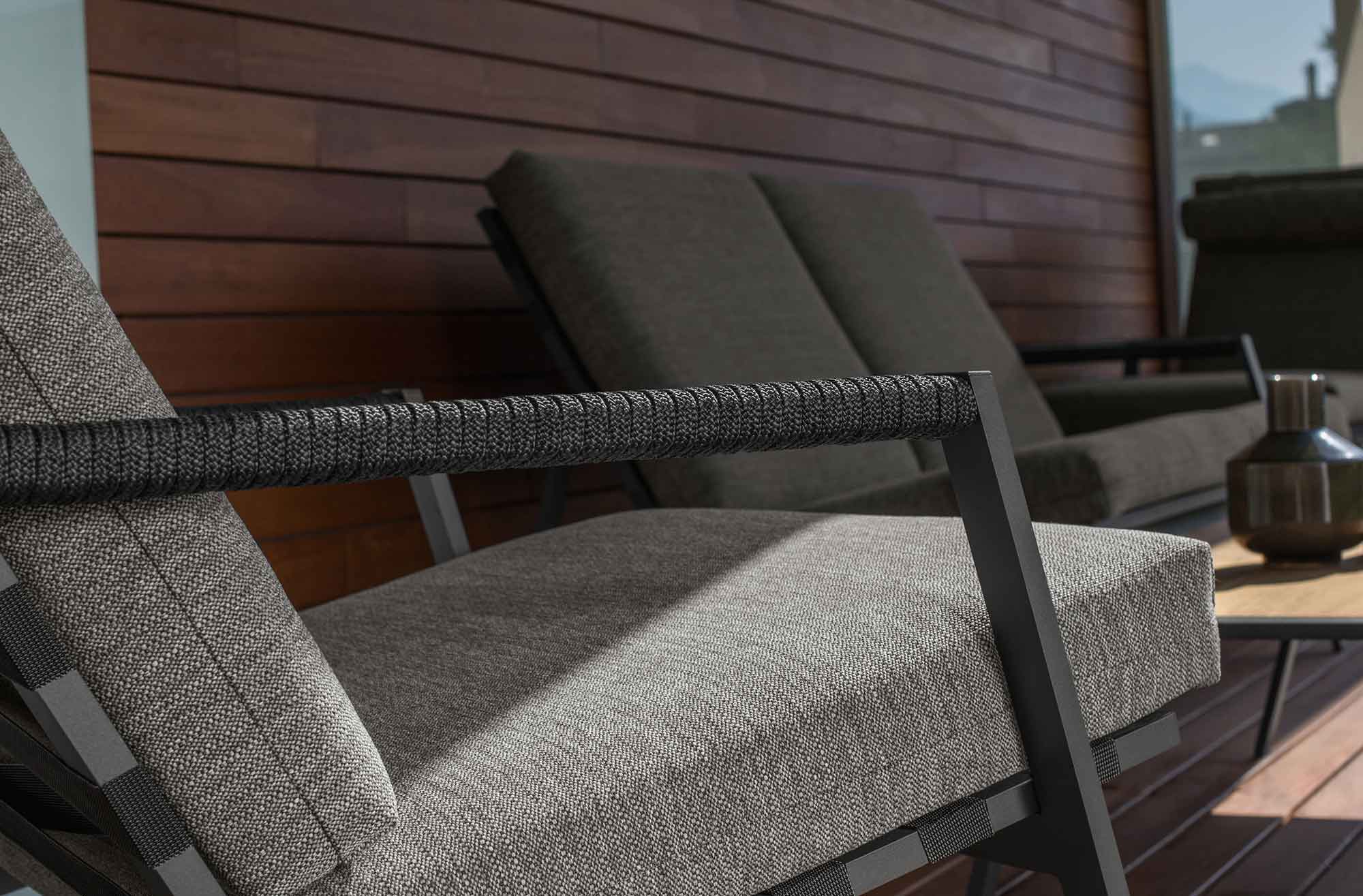 Este espíritu rústico se reinterpreta buscando la síntesis formal del mueble contemporáneo. Como resultado de todo esto, se consigue una propuesta de piezas de exterior donde se mezclan una amplia variedad de materiales. Entre estos están el aluminio o el plástico, que conviven con otros más tradicionales como puede ser la cuerda, que se encarga de conectar emocionalmente con la memoria del usuario.