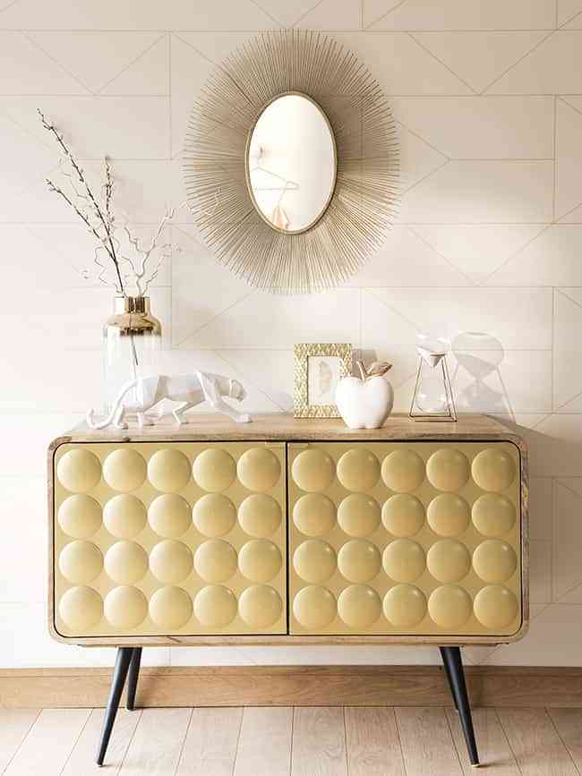 Si tenemos debilidad por este color tan de tendencia, dejemos que invada el espacio. La única norma a seguir es que su acabado sea mate, para evitar un efecto final barroco o un tanto opulento. Y por otra parte nada actual. Las maderas decapadas o con un tratamiento envejecido son excelentes compañeras para los oros en general. Por ejemplo funcionan muy bien los aparadores de este tipo y las sillas doradas con un diseño vintage. Tal vez nos apetezca reservar un hueco en el salón a estas piezas. Serán infalibles para poner ese toque de exótico desierto tan cautivador.