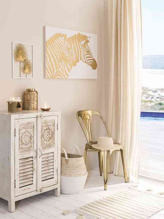 Ahora bien, puede que los dorados no ocupen los primeros puestos de nuestra lista de favoritos. Pero tampoco queremos renunciar a ellos. En ese caso, bastará con introducirlos a través de objetos decorativos, láminas y pequeñas lámparas. Desde cuadros de cebras, a composiciones florales muy minimal, vasijas y portavelas.