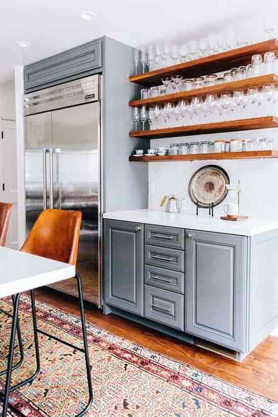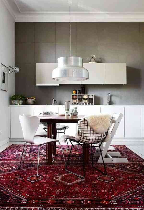 Por ejemplo, me encantan los kilims en las cocinas modernas. Crean un contraste muy atractivo con el mobiliario ultramoderno y los electrodomésticos de acero inoxidable. Y no vas a ponerlas justo delante de la encimera ni en la zona de trabajo (por razones obvias), pero puede resultar perfectos en la zona de office.