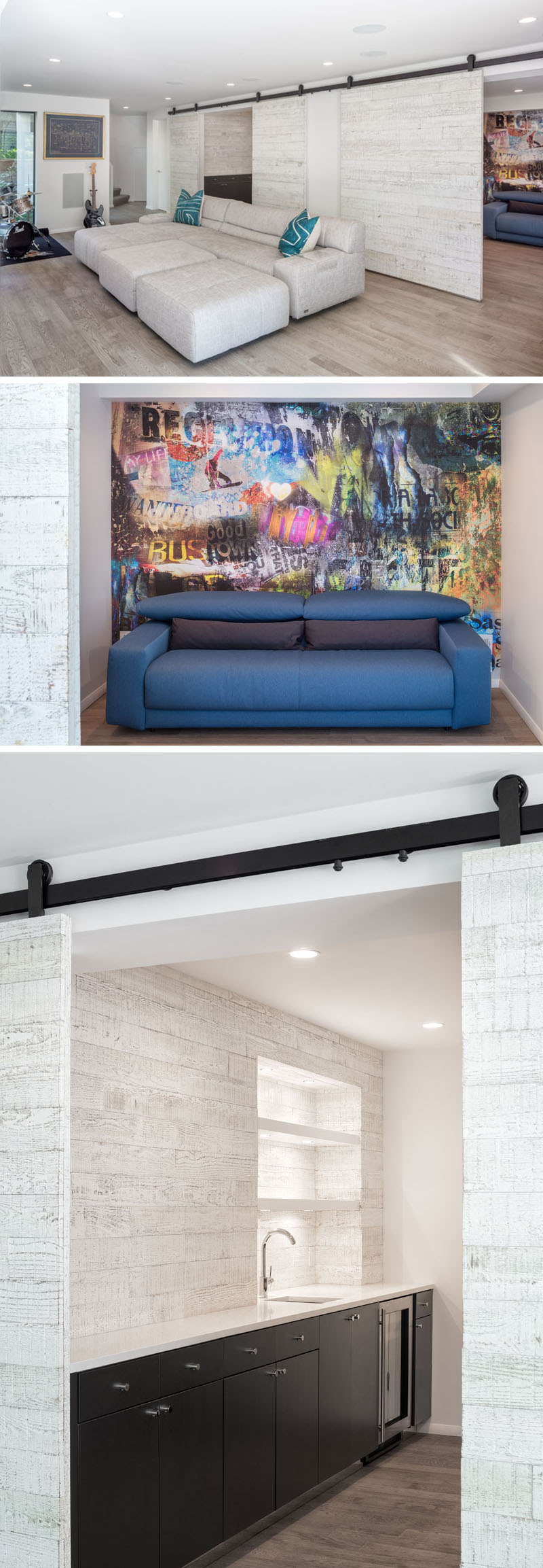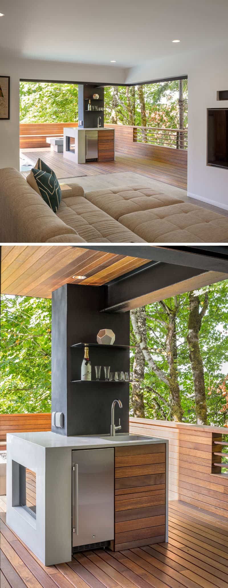 Un sistema de puerta de esquina abatible que se apila dentro de las paredes, permite que la sala familiar se abra a un área al aire libre con una barra de cemento personalizada con un refrigerador y estantes personalizados de acero ennegrecido.