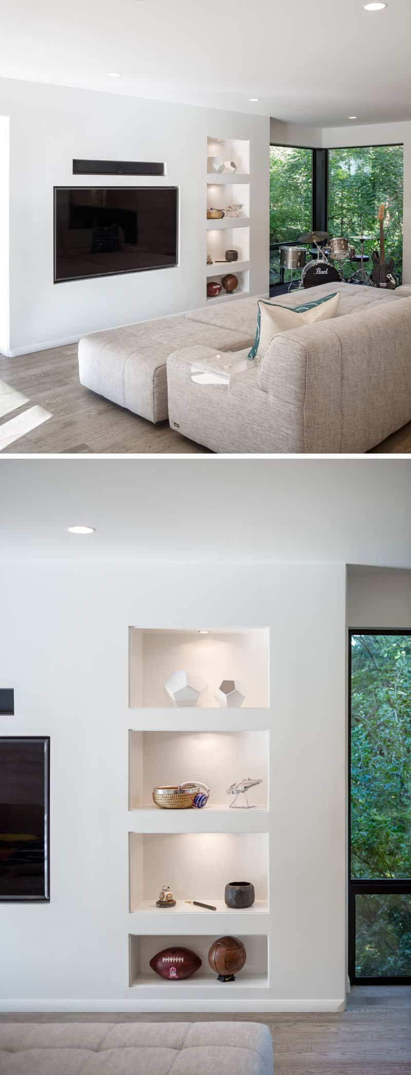 Frente al sofá de la sala de estar hay un televisor que se apoya en la pared, una estantería empotrada con iluminación y un compartimento de almacenamiento oculto.