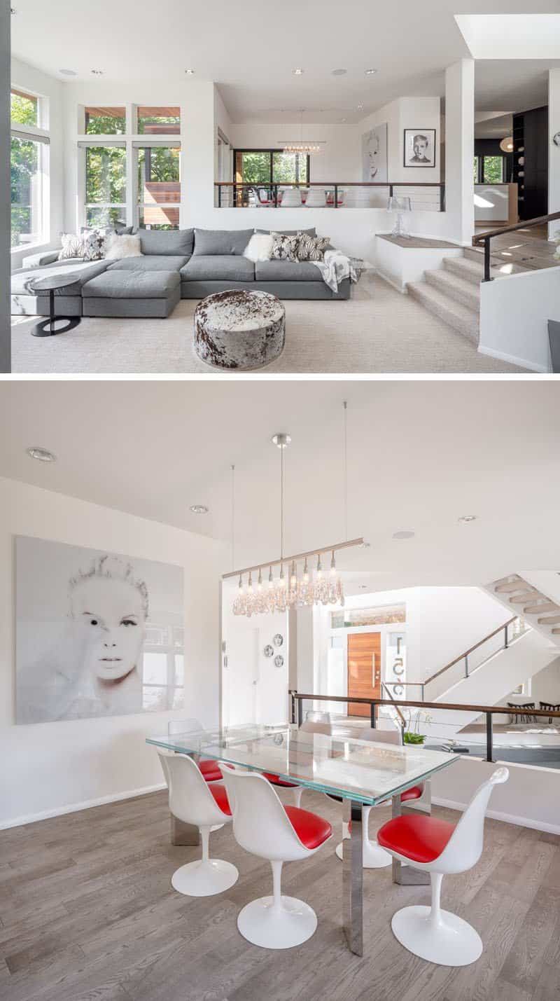 En el primer nivel de la casa, nos encontramos el comedor y bajando unos escalones llegamos a la sala de estar. En el comedor, los diseñadores eliminaron el esquema de color terracota, verde musgo y amarillo con acceso limitado al exterior, y lo abrieron hacia el exterior con ventanas, puertas y pintura blanca brillante añadidas.
