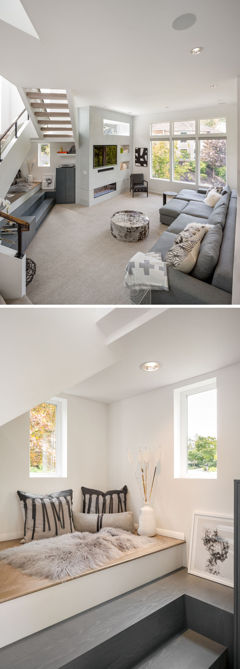 En el interior y en la sala de estar, los pisos de madera se transforman en una alfombra de lana que hace que el espacio sea acogedor y confortable. Una nueva chimenea de gas reemplazó a una chimenea anticuada con un borde de pizarra, y los diseñadores agregaron gabinetes ceñidos de color gris oscuro personalizados y un rincón de lectura debajo de las escaleras para los niños. Un sofá Cadillac personalizado lo suficientemente grande como para caber a toda la familia fue diseñado para descansar al máximo.