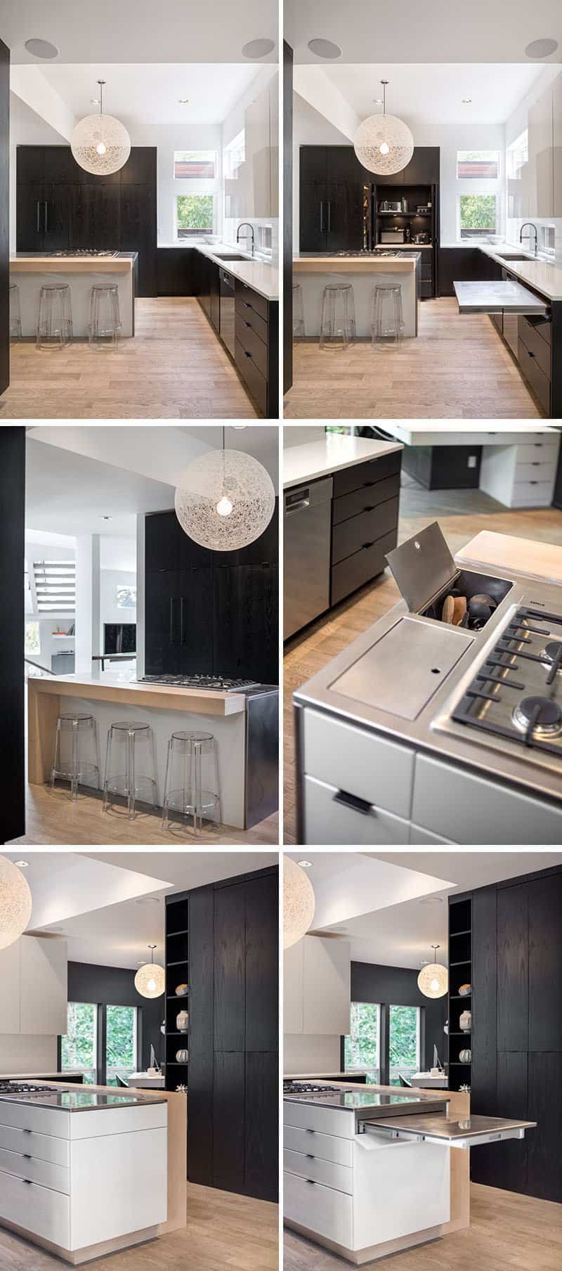 La cocina original era pequeña, por lo que tuvieron que trabajar duro para conseguir ampliarla. También añadieron elementos ocultos y multifuncionales como superficies de preparación extraíbles personalizadas, recipientes de utensilios y una rejilla para secar los platos en el gabinete sobre el fregadero. La cocina también incluye gabinetes a medida con un acabado de pintura automotriz blanco y gabinetes de roble teñidos en negro mate azabache.