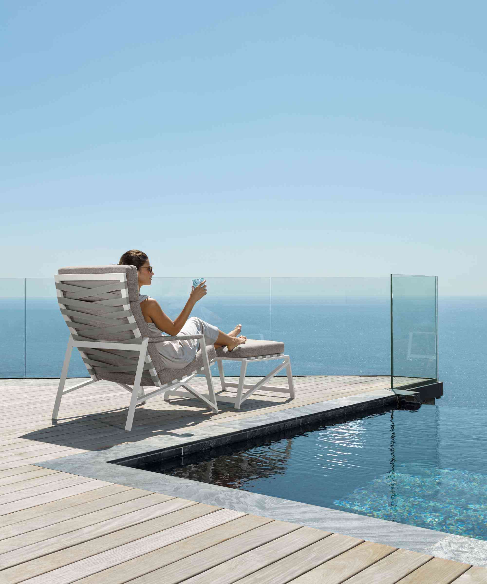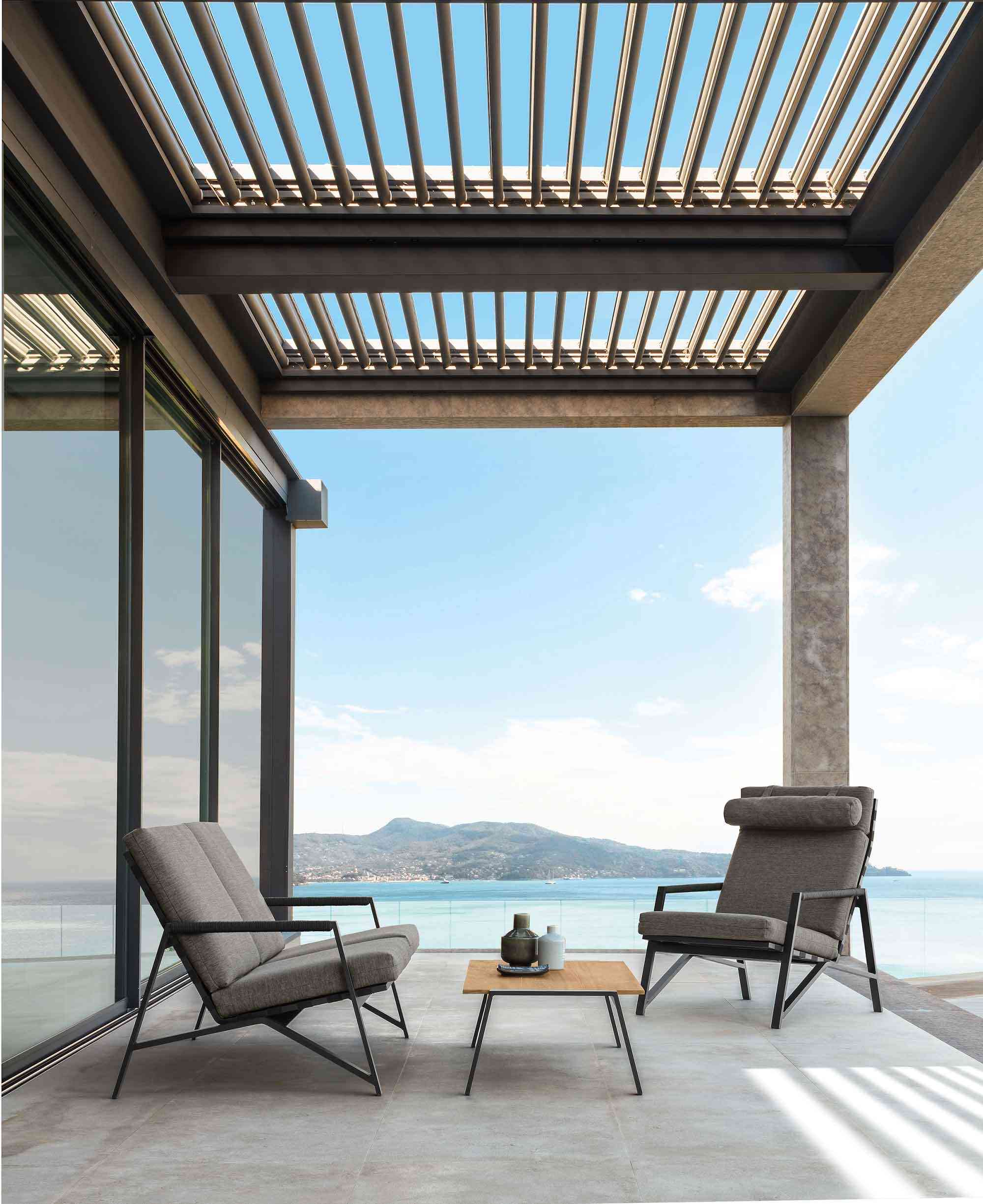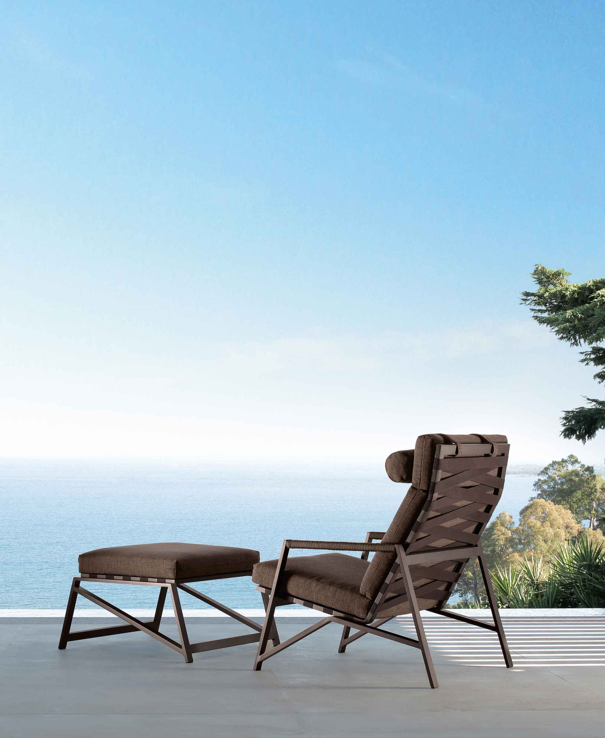 Para su diseño, el arquitecto buscó la inspiración en lo más profundo del oeste americano, y más concretamente en los pórticos de las casas de campo y los ranchos de esta parte de los Estados Unidos, construcciones que están amuebladas con amplios sillones y altos respaldo. Dos puntos de partida que Ramón Esteve reinterpreta para suavizarlos bajo una perspectiva contemporánea y minimalista. De esta manera, el estilo rústico da paso a una serie de muebles modernos donde materiales como el aluminio coexisten con otros más tradicionales como la cuerda.