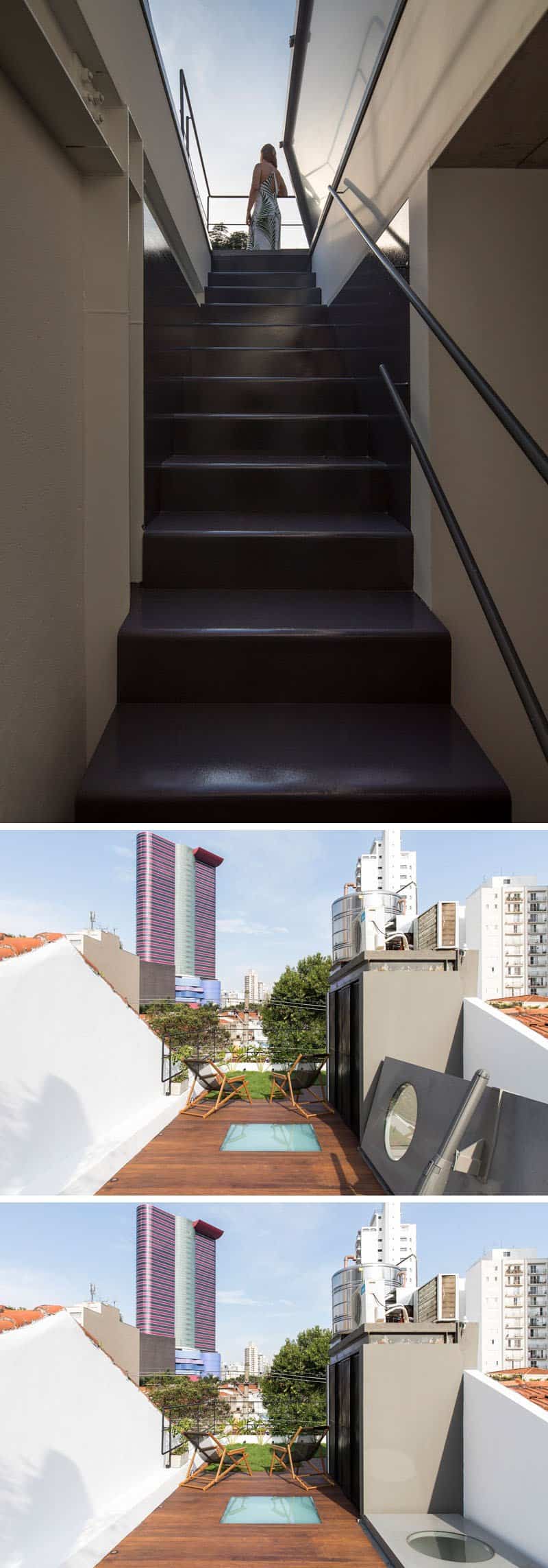 Las escaleras continúan hasta el techo, donde un tragaluz da acceso a la terraza de la azotea.