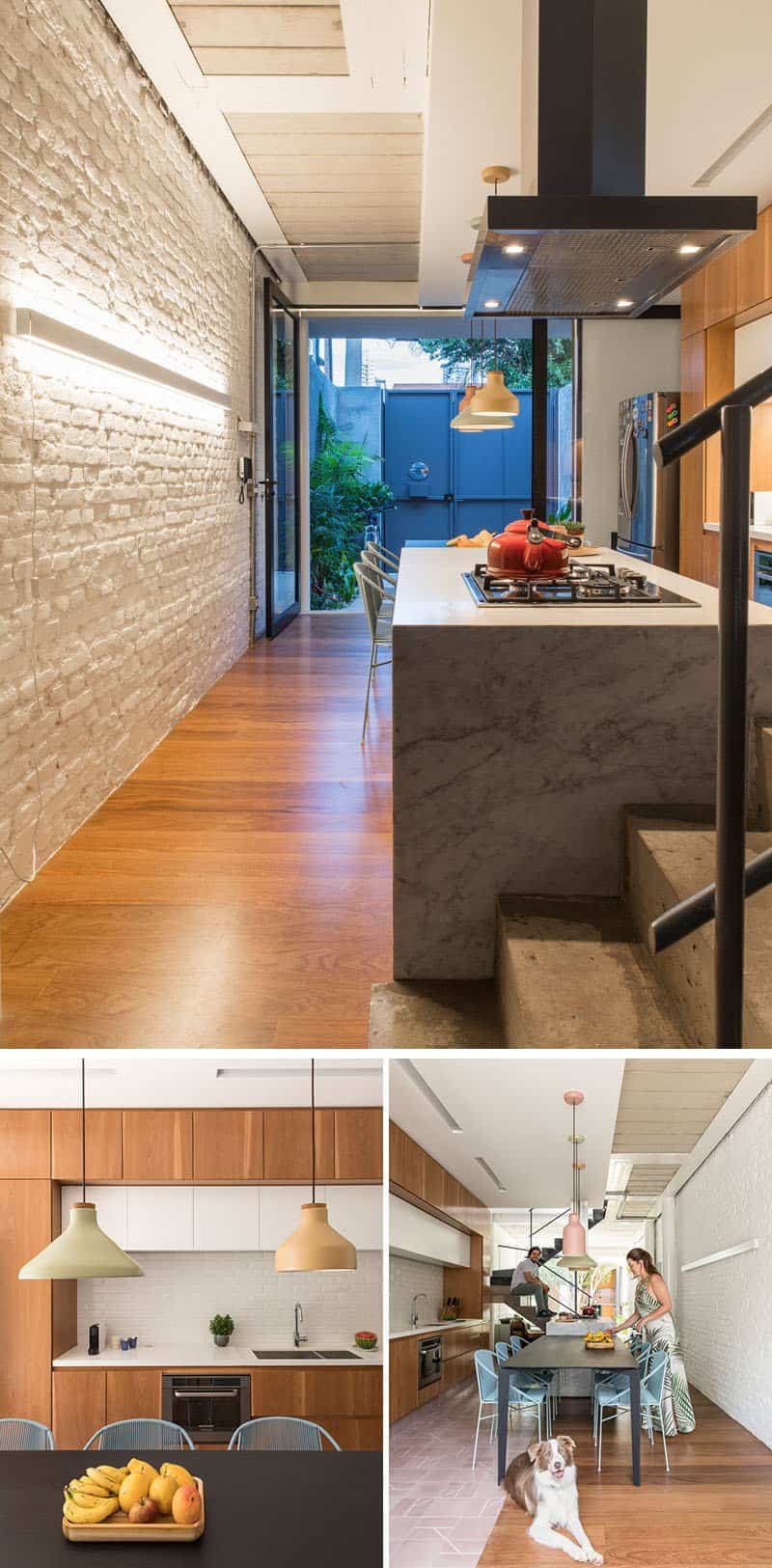 En la cocina nos encontramos una pared de ladrillo original que ha sido pintada para mantener el espacio brillante y acogedor. En la pared opuesta, se colocaron los muebles de la cocina, muebles de madera y color blanco con un estilo minimalista. La isla de la cocina se extiende a lo largo de toda la cocina.