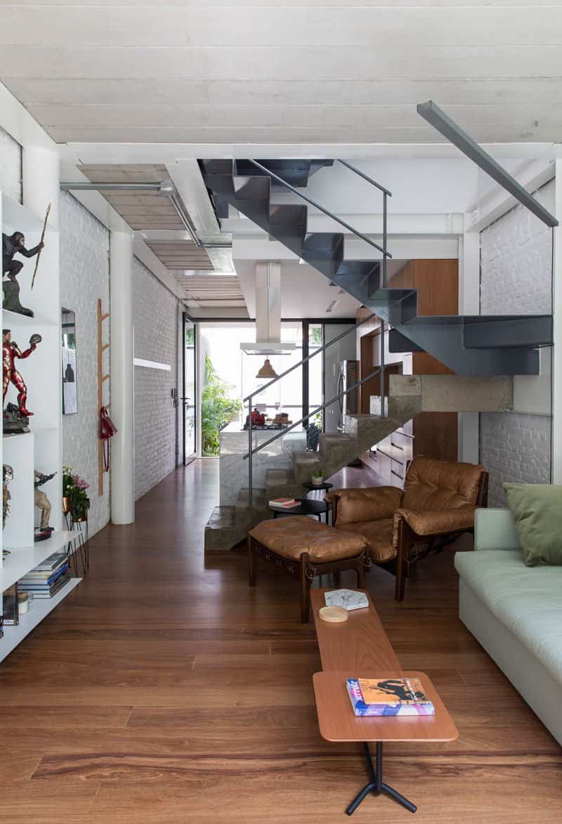 En el interior, y entre la sala de estar y la cocina, se ubica una escalera de hormigón y acero que conducen al segundo piso de la casa.