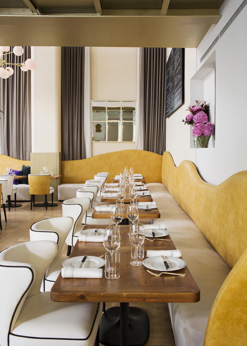 Debido a la cantidad de luz natural que penetra en el local, el restaurante cambia drásticamente si es de día o de noche. De día es alegre y vital, mientras que de noche las cortinas que se cierran y la iluminación, realizada a base de claros y oscuros, ofrecen un ambiente cálido e íntimo.