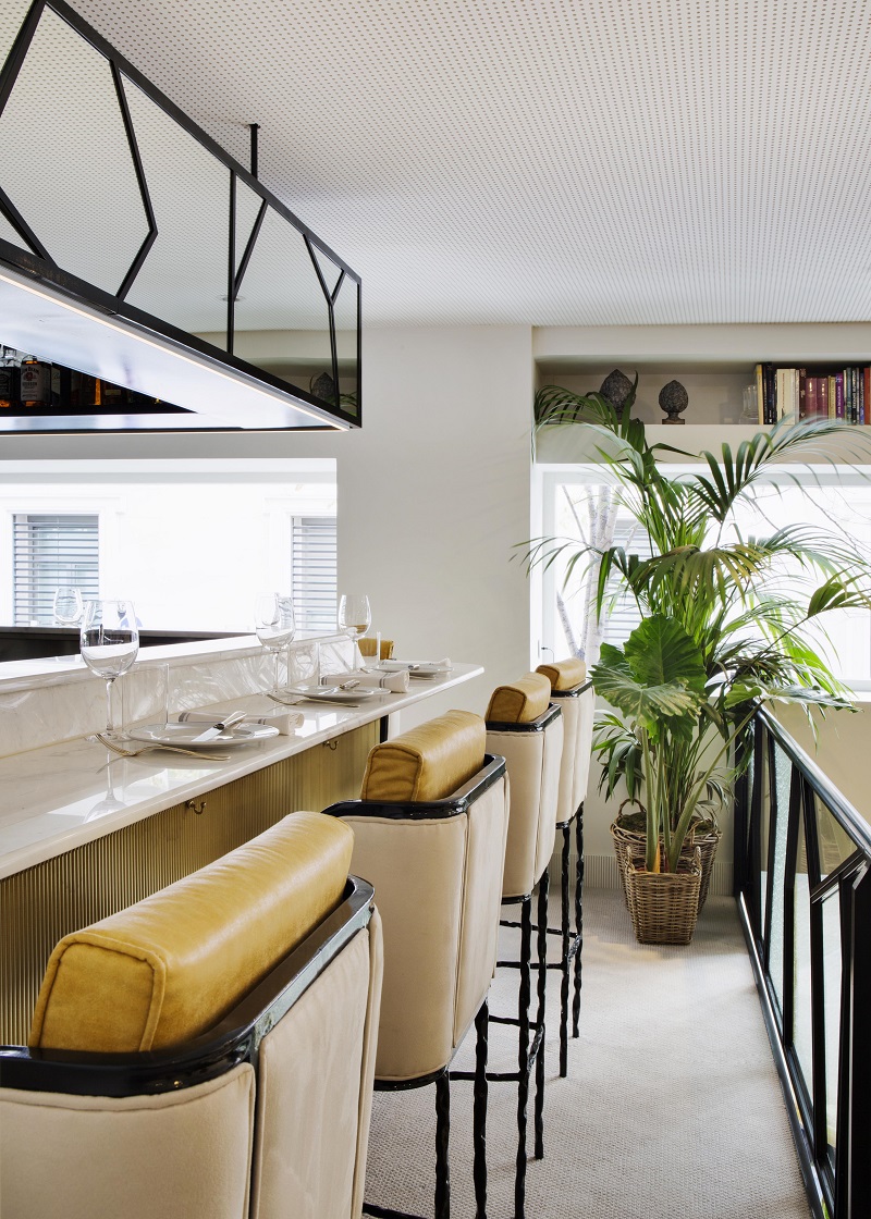 Para diferenciar la planta superior de la planta baja, se apostó por instalar una enorme barra de bar en esa primera planta. Esta barra se dividió en dos partes. Durante el día por un lado se puede comer y por el otro lado se ofrecen originales cócteles. Por la noche, la barra permite alargar la sobremesa entre amigos acompañados de una copa.