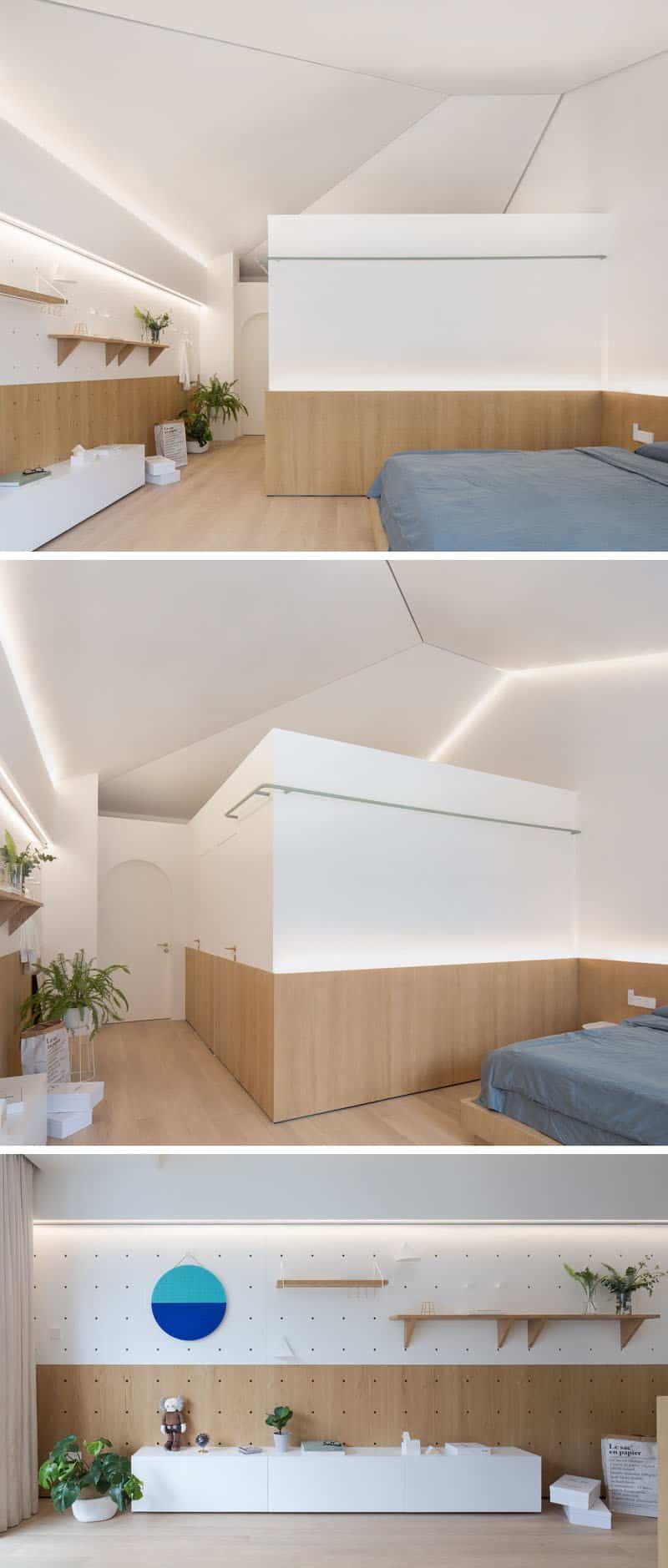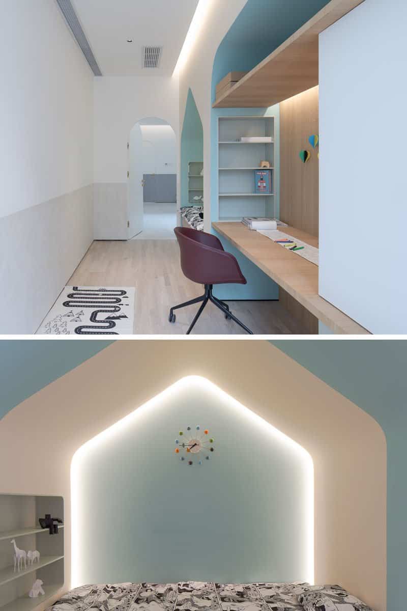En el segundo piso de la casa, se encuentra ubicado el dormitorio infantil, con una cama empotrada, escritorio y espacio de almacenamiento. La iluminación oculta y los colores suaves crean un ambiente tranquilo para la habitación.