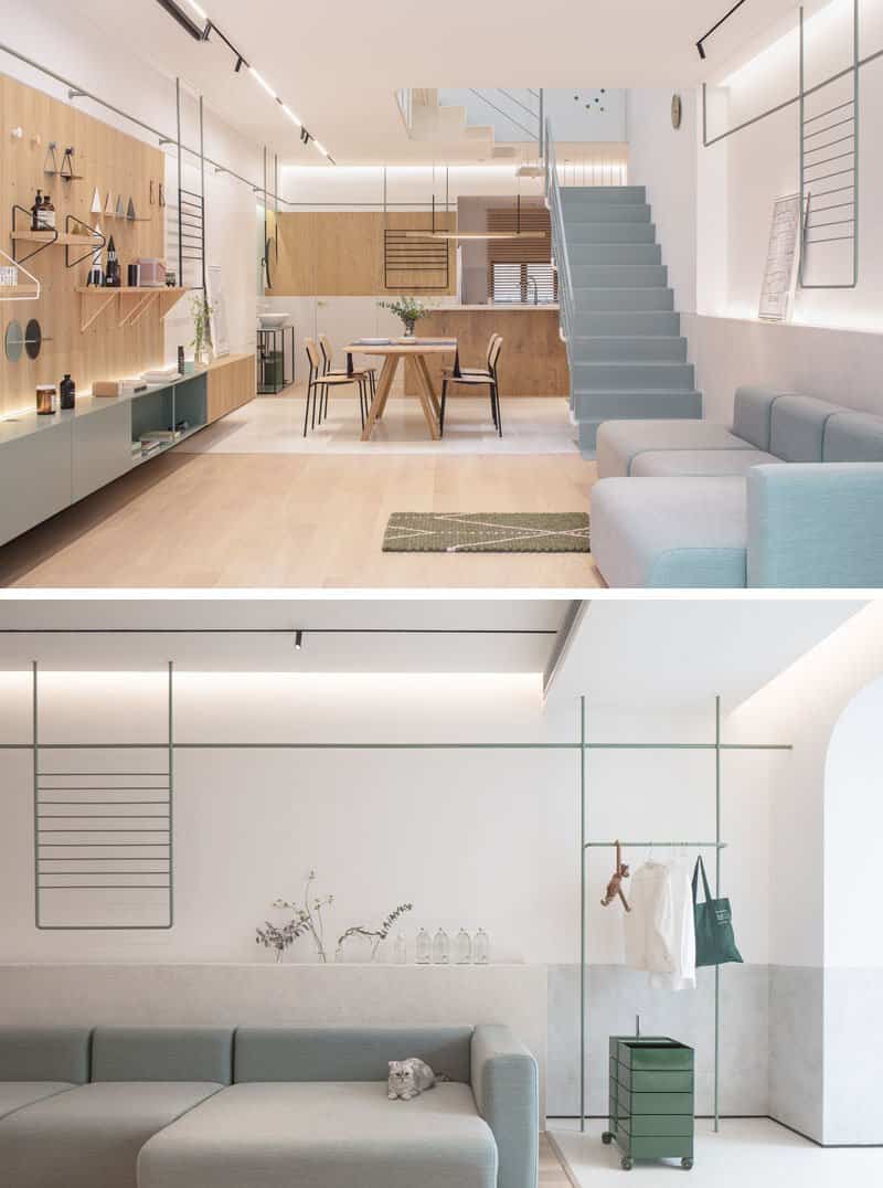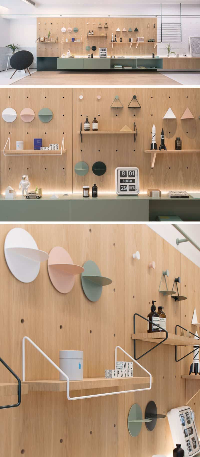 Frente al sofá hay una pared de muebles modular que los diseñadores han llamado “tabla de vida”. Se puede decorar o ensamblar con accesorios de diferentes maneras, cambiando a medida que cambian las necesidades de la familia.